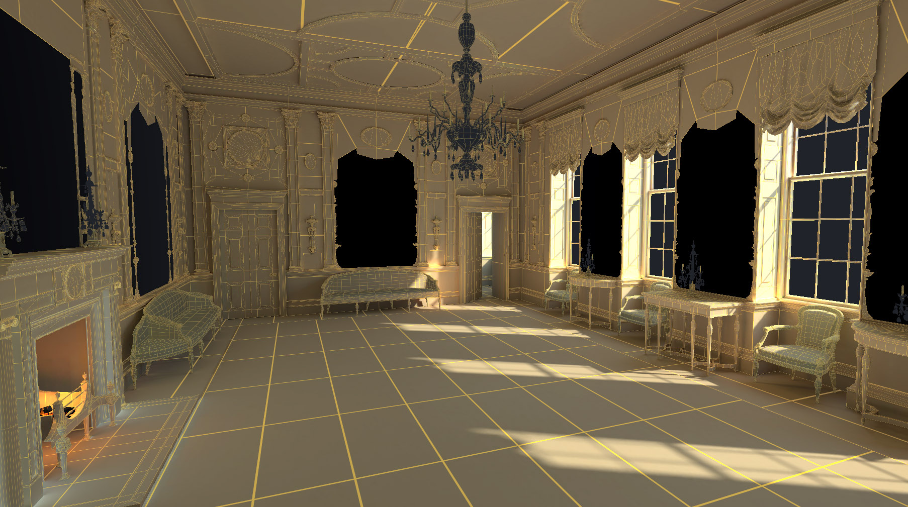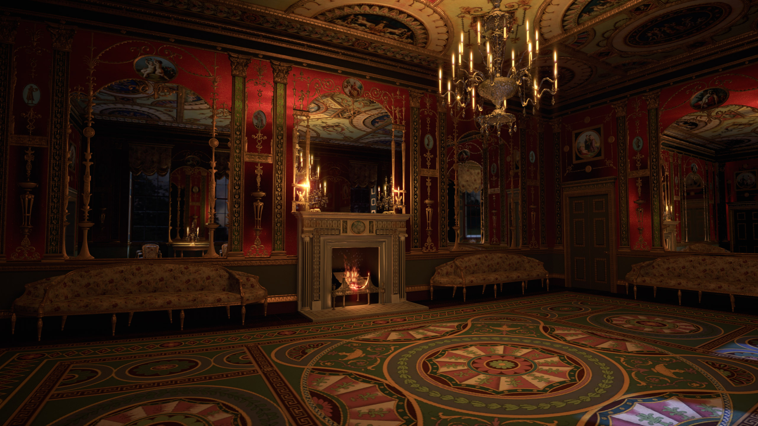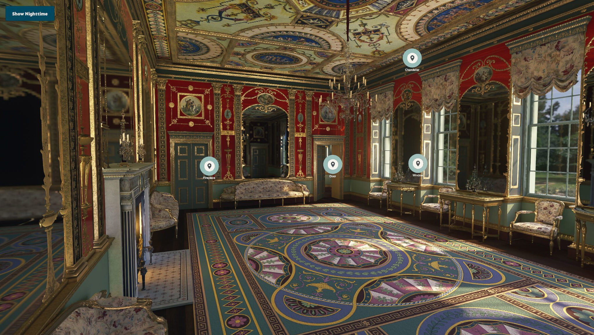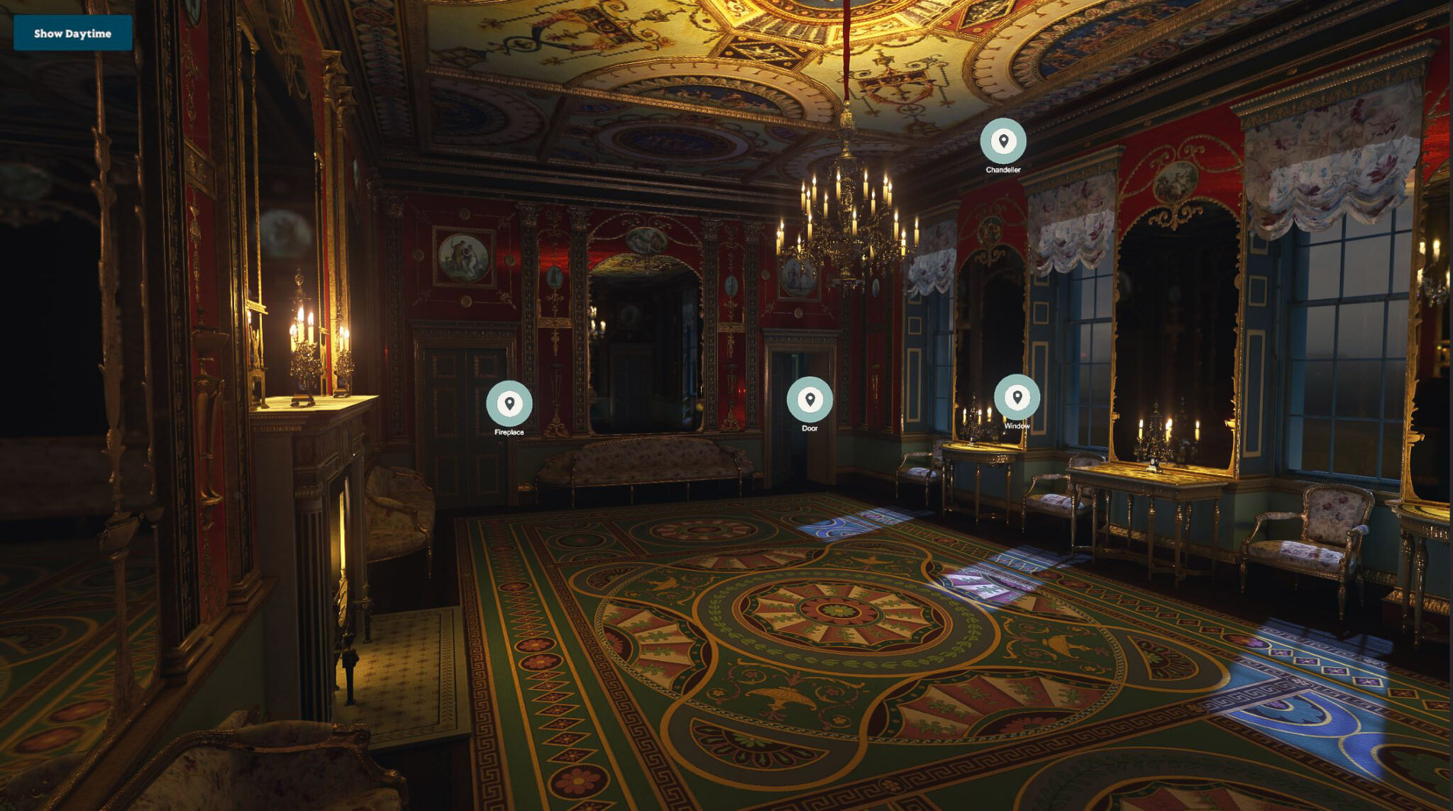 Bei der Gestaltung dieses Erlebnisses gab es viele Herausforderungen zu bewältigen. Fast alles im Raum ist reflektierend, was für den Computer eine Herausforderung darstellt, da er herausfinden muss, wie Spiegel Spiegel reflektieren, Glasscheiben reflektieren und Kronleuchter reflektieren usw. Dies alles musste in einem Raum geschehen, der tagsüber durch Tageslicht beleuchtet wird Nacht bei Kerzenschein. Das Noho-Team musste mehrere Versionen des Modells erstellen, um unter verschiedenen Plattformen und Bedingungen zu funktionieren. Um den Raum zu gestalten, haben wir auf eine Vielzahl von Quellen für Beleuchtungsreferenzen, Materialien und Texturen zurückgegriffen und mussten sogar das Äußere so modellieren, dass die Reflexionen und das Licht im Raum so authentisch wie möglich waren.
