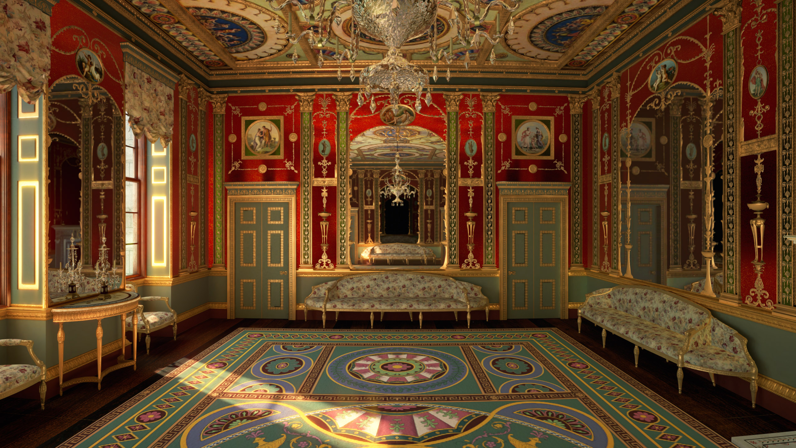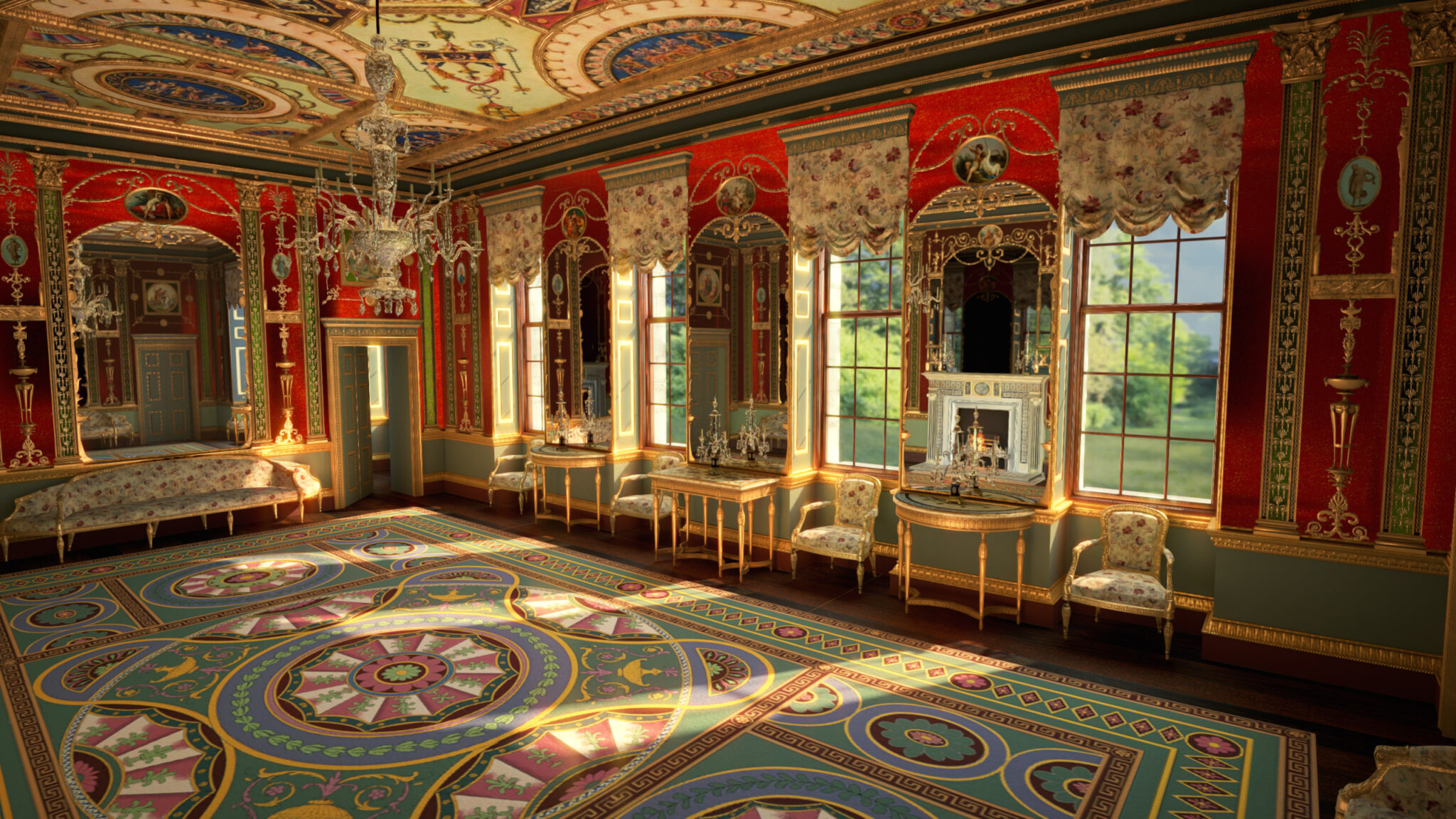 Der virtuelle Raum wurde unter Verwendung erhaltener Glasscheiben und Möbel aus dem V&A Museum und der Sammlung des Duke of Northumberland sowie Objekten aus der Sammlung des National Trust und den Originalentwurfszeichnungen des Architekten aus dem Sir John Soane’s Museum entwickelt.