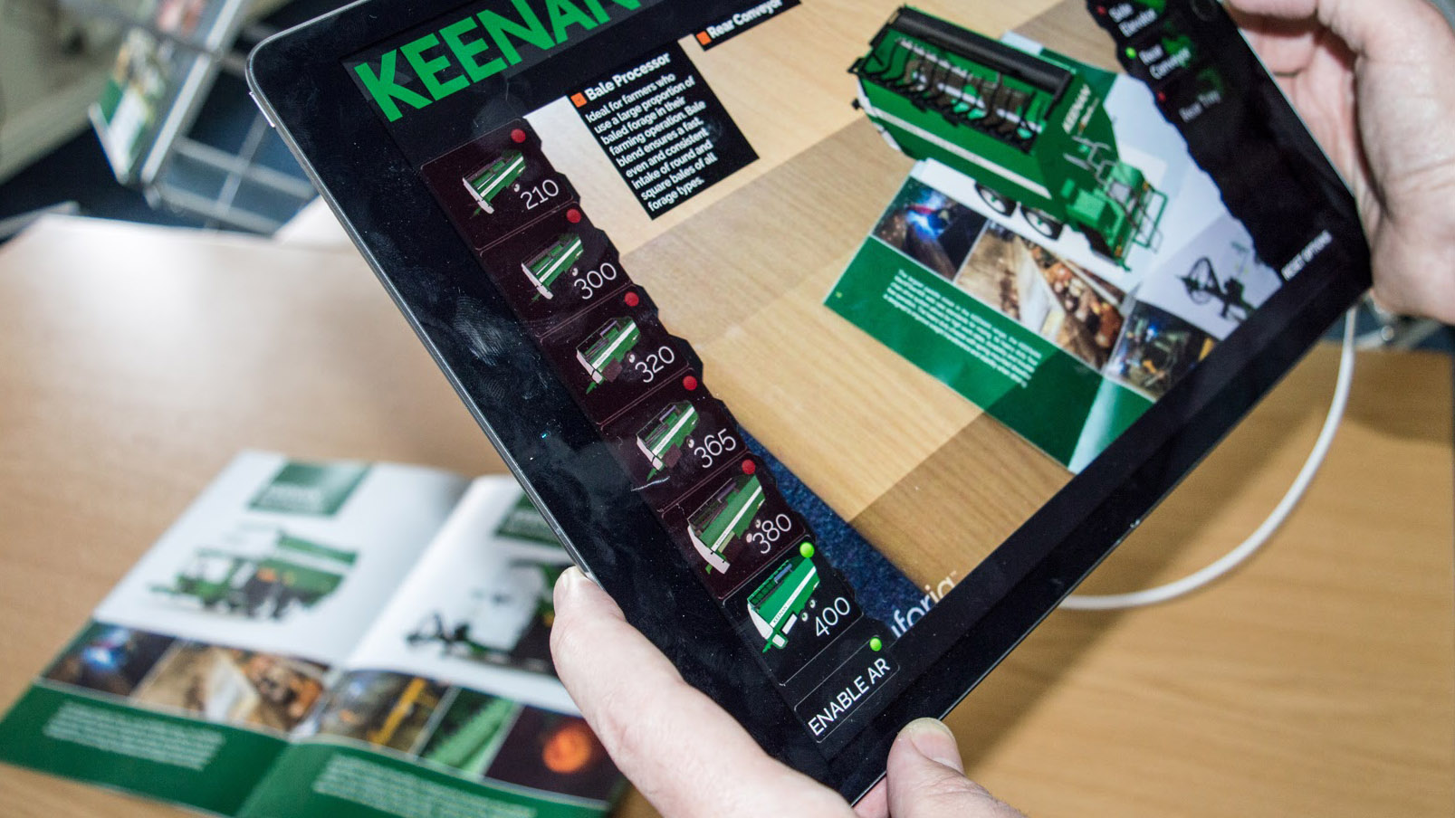 Ebenfalls erstellt wurde eine Vertriebsanwendung für Tabletts. Der Benutzer kann sich in Echtzeit um die 3D-Modelle der verschiedenen Mischwagen bewegen und Zubehörteile und -funktionen hinzufügen. Die App wurde ebenso per AR mit der Infobruschüre verknüpft, sodass das 3D-Modell auf der Seite des Produkts selbst erschien.